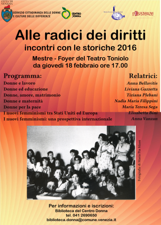 Il Servizio Cittadinanza delle Donne e Culture delle differenze - Centro Donna in collaborazione con la Società Italiana delle Storiche (sez. del Veneto) e rEsistenze, dopo il grande successo di adesioni riscontrato nell’edizione dello scorso anno, organizza anche per il 2016 un Corso di Formazione sul percorso delle donne alla conquista dei diritti.